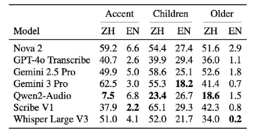 Even the best-performing models still reach 18.2% WER on English children’s speech, making this a critical bottleneck for deployment.