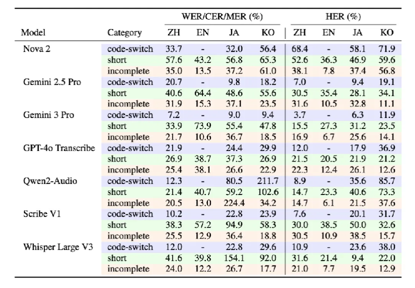 The issue is no longer just recognition accuracy. Under realistic conditions, models frequently exhibit instability, degradation, and even semantic hallucinations—generating plausible but incorrect content that was never spoken.