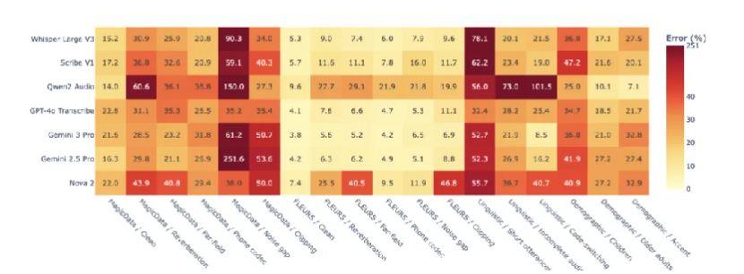 Figure 2. Error heatmap of seven ASR models evaluated on the WildASR benchmark