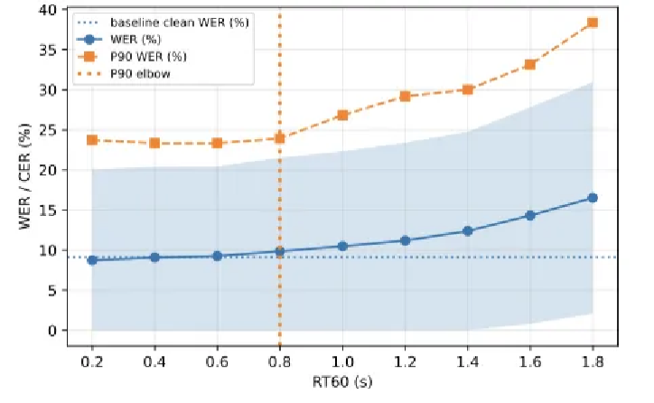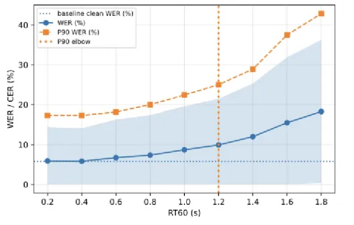 As distortion increases, average WER rises gradually, while the 90th percentile error increases sharply.